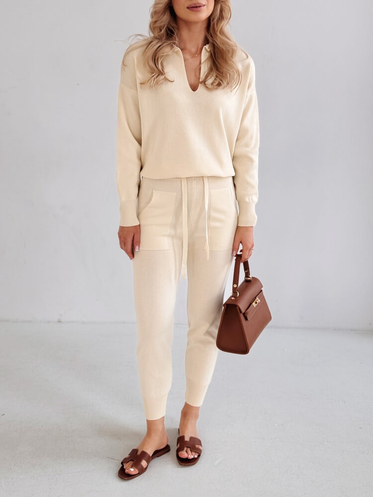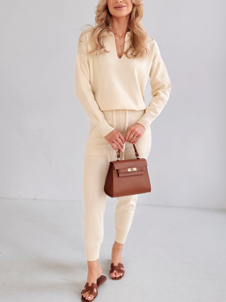 Miękki komplet wykonany z przyjemnej, elastycznej dzianiny w odcieniu écru.
