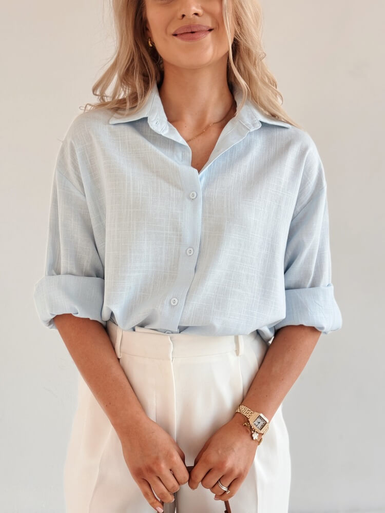 Koszula zapinana jest na drobne guziczki w kolorze materiału.