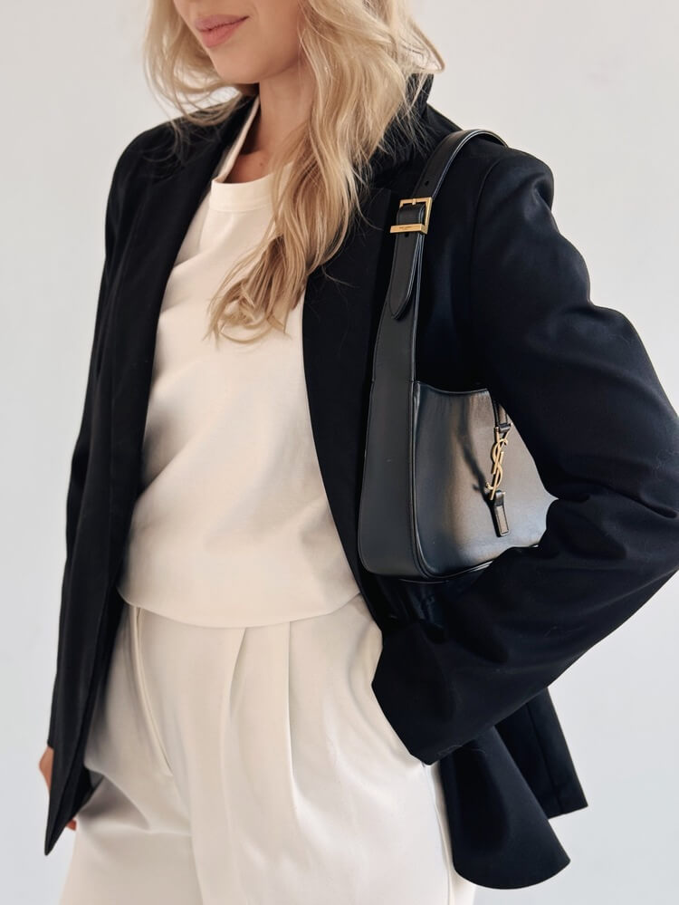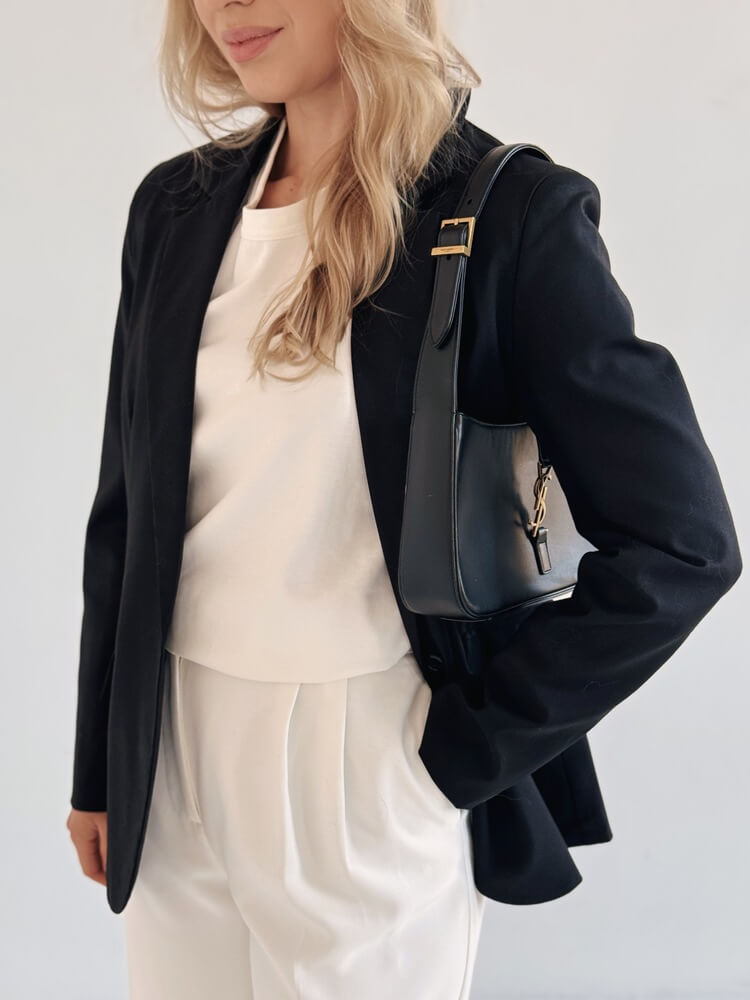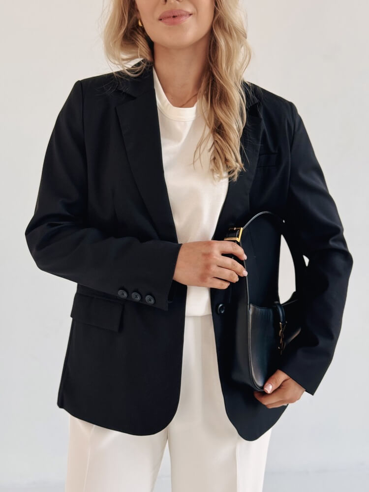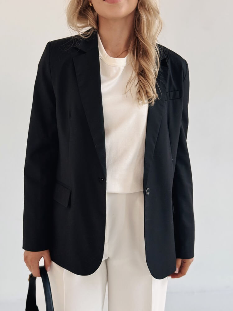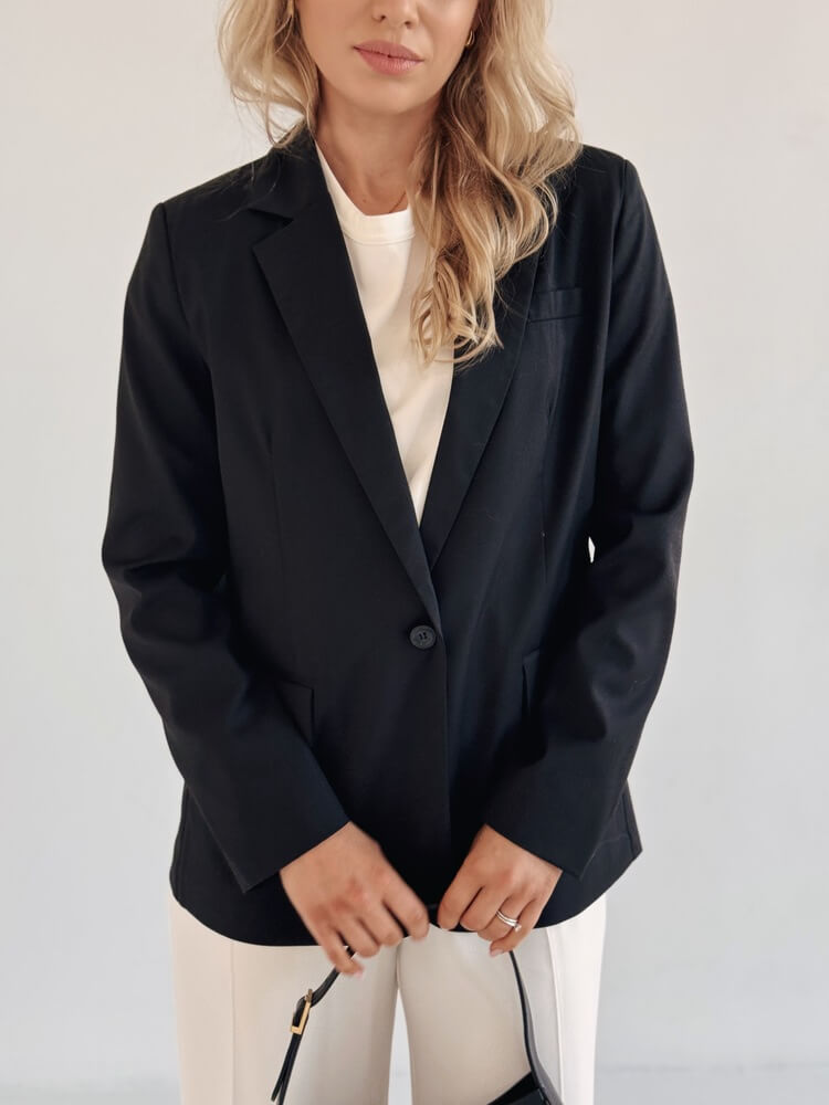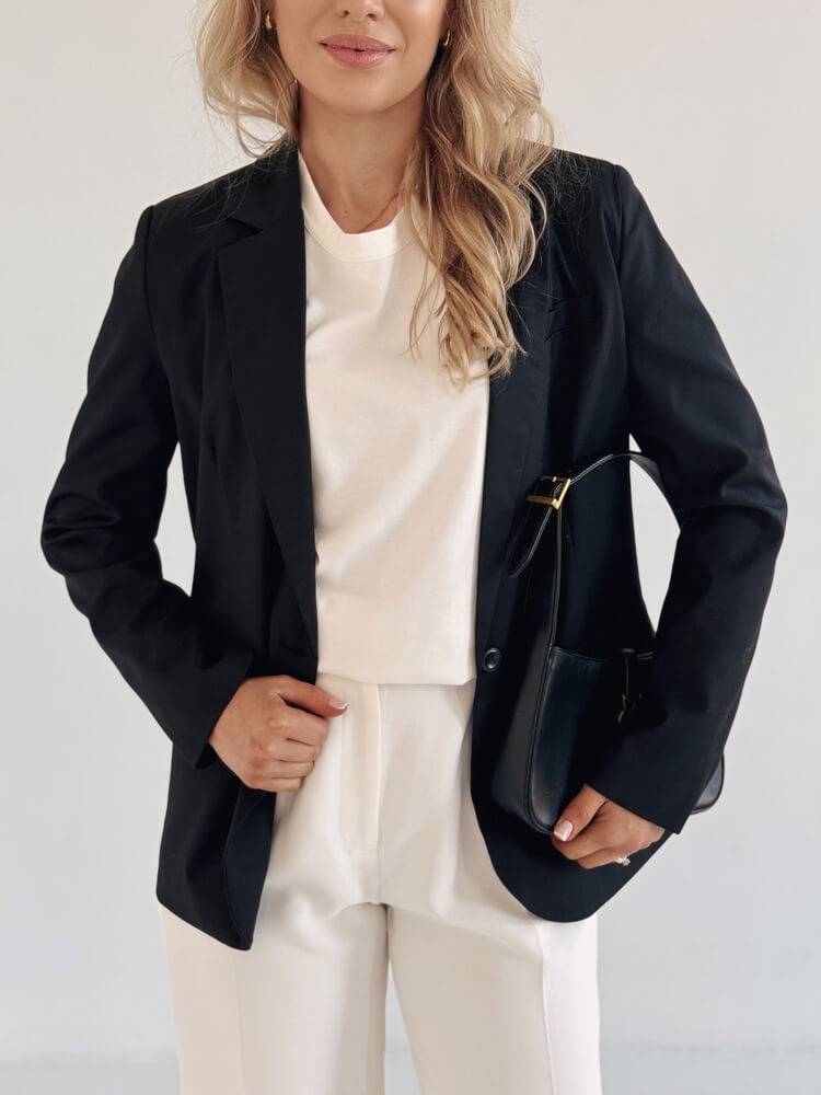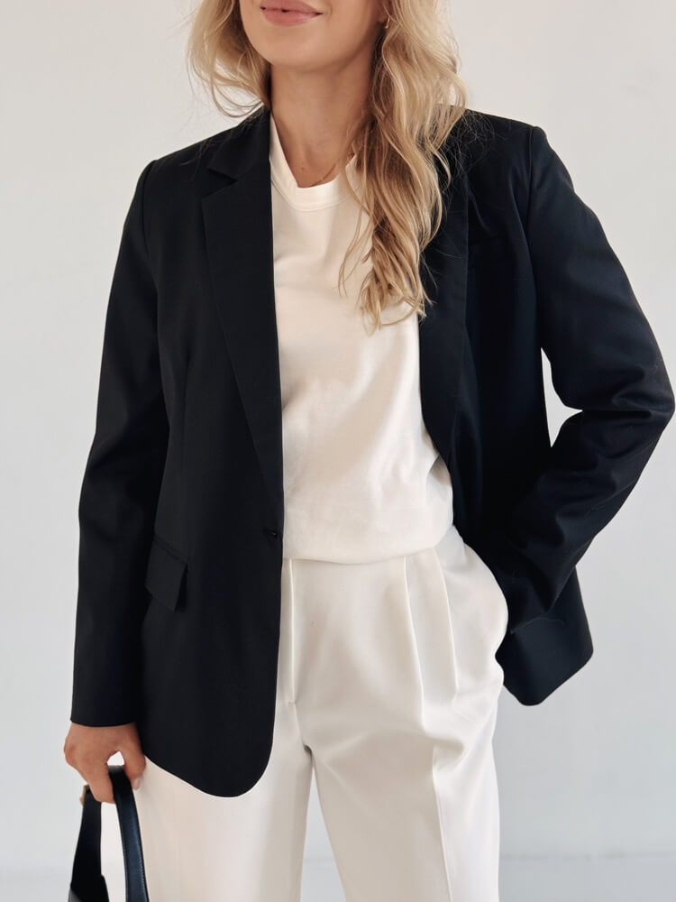 Przykład idealnej marynarki do garderoby kapsułowej – pasuje do wszystkiego.