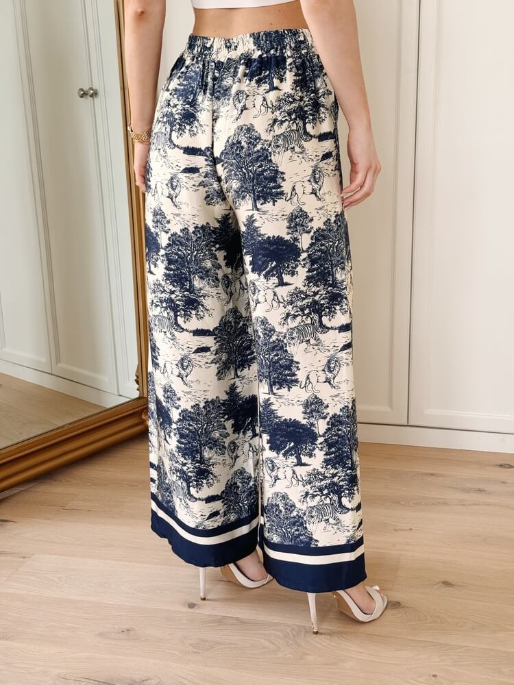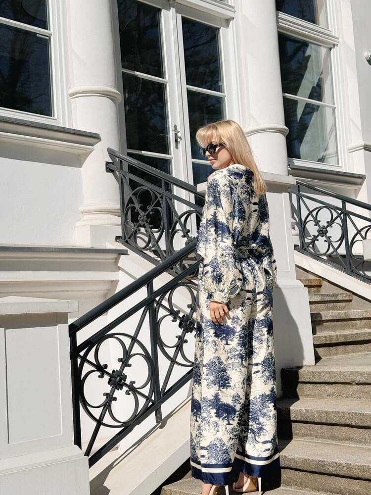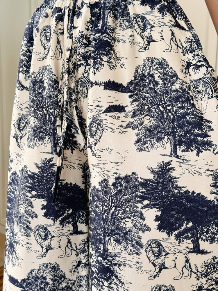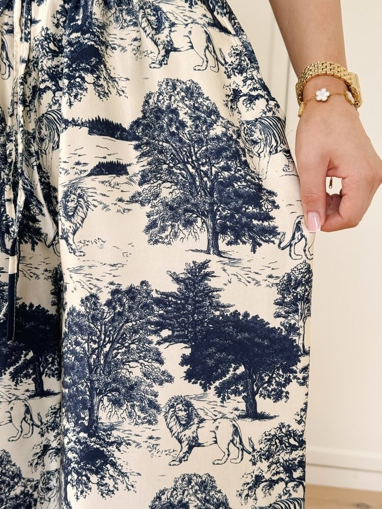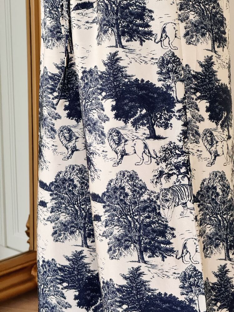 Uszyta z tkaniny Toile de Jouy – francuskiego wzoru przedstawiającego scenki rodzajowe, w tym przypadku są to elementy natury i obrazy egzotycznych zwierząt.