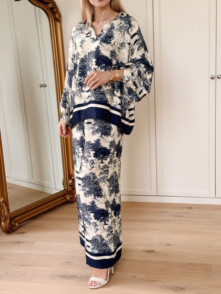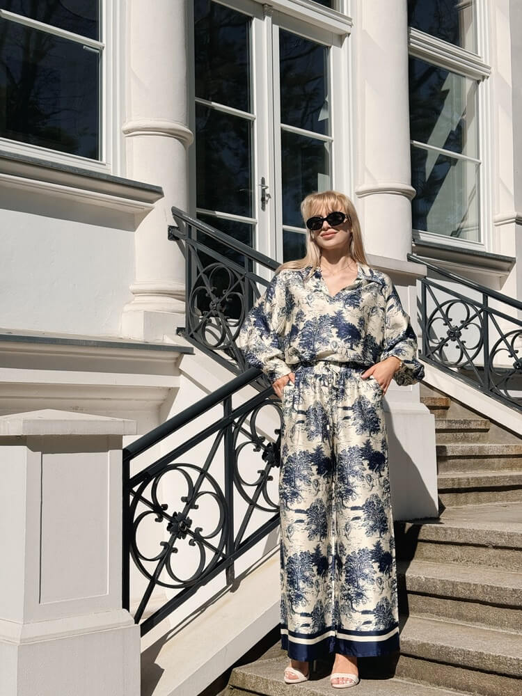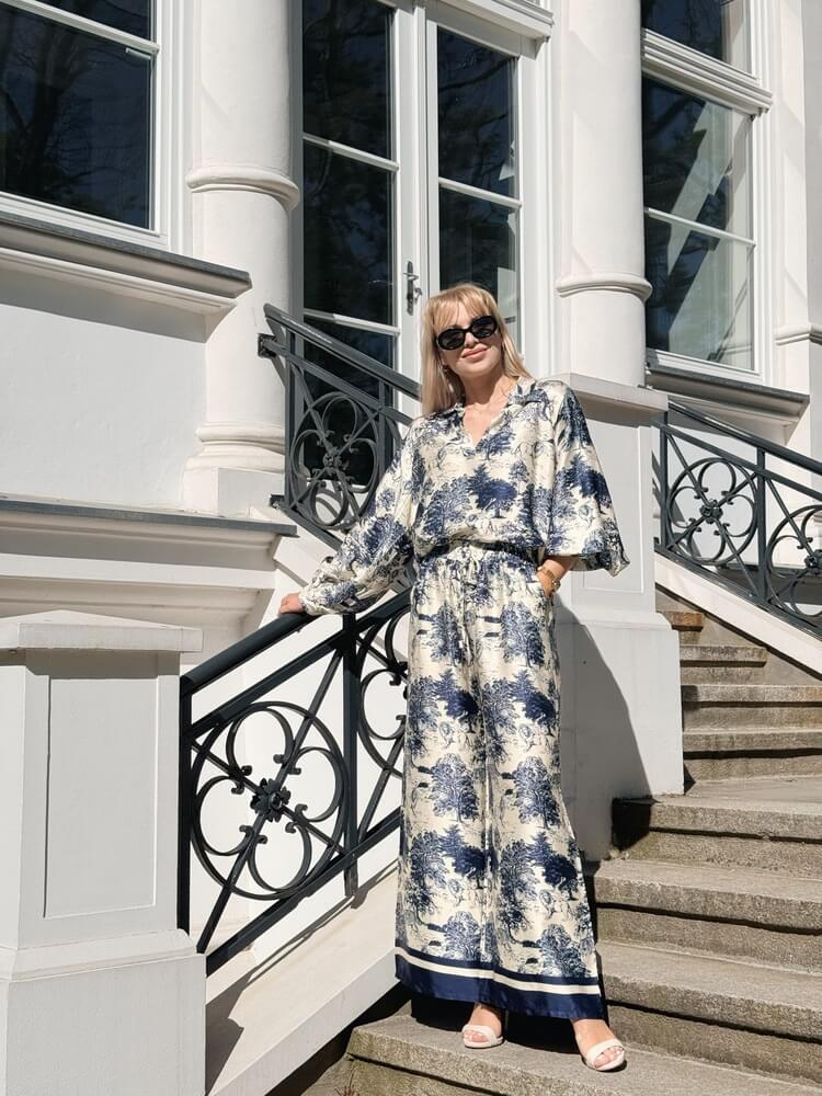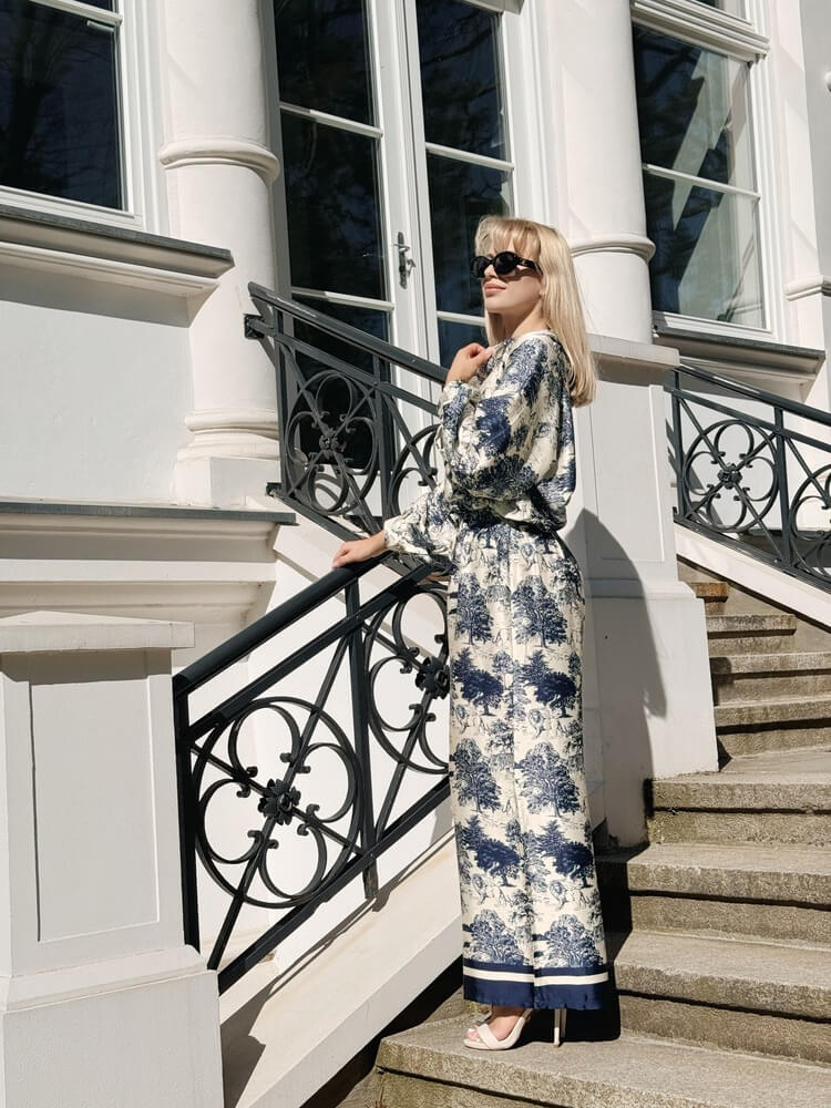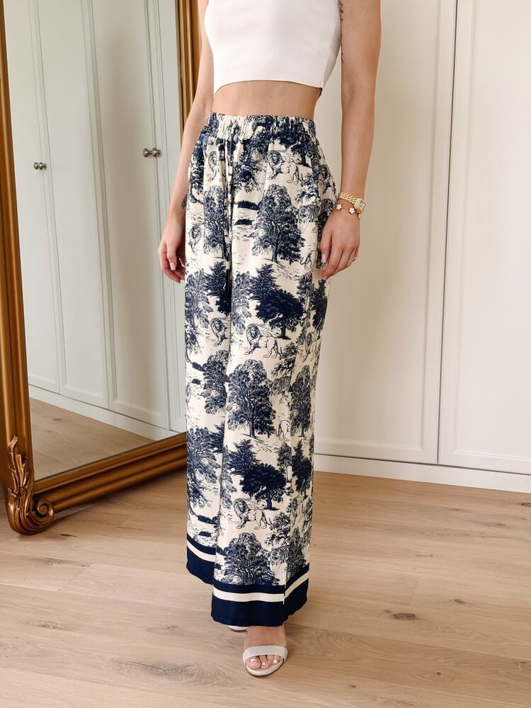 Uszyta z tkaniny Toile de Jouy – francuskiego wzoru przedstawiającego scenki rodzajowe, w tym przypadku są to elementy natury i obrazy egzotycznych zwierząt.