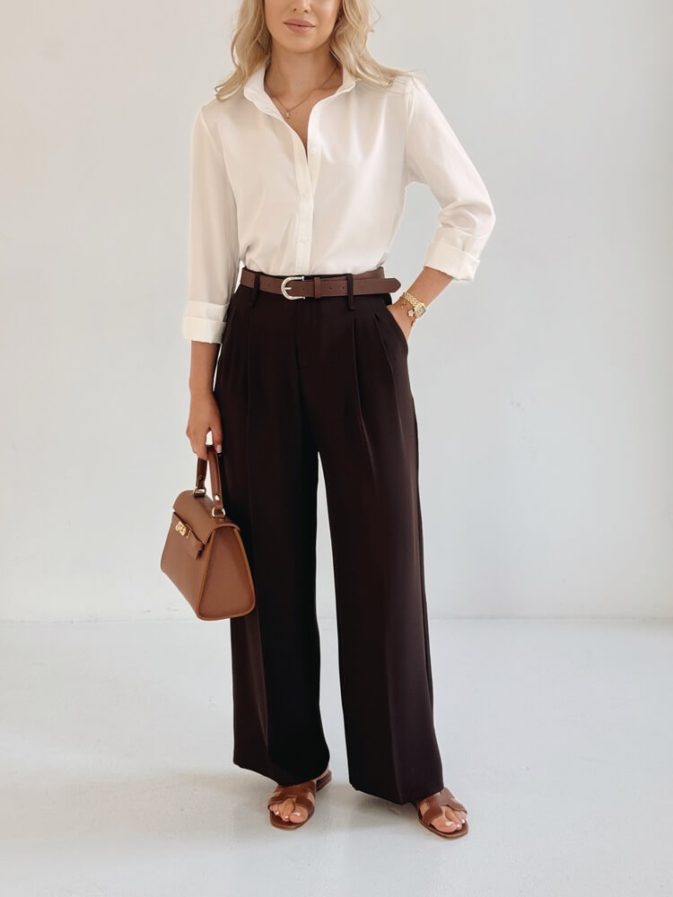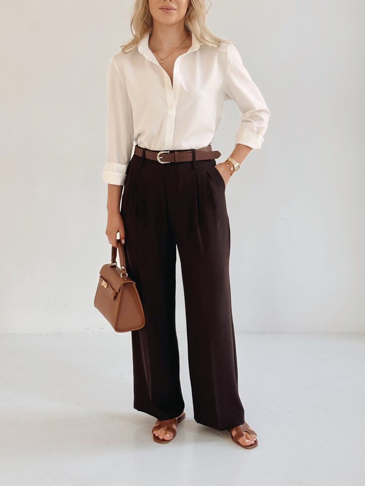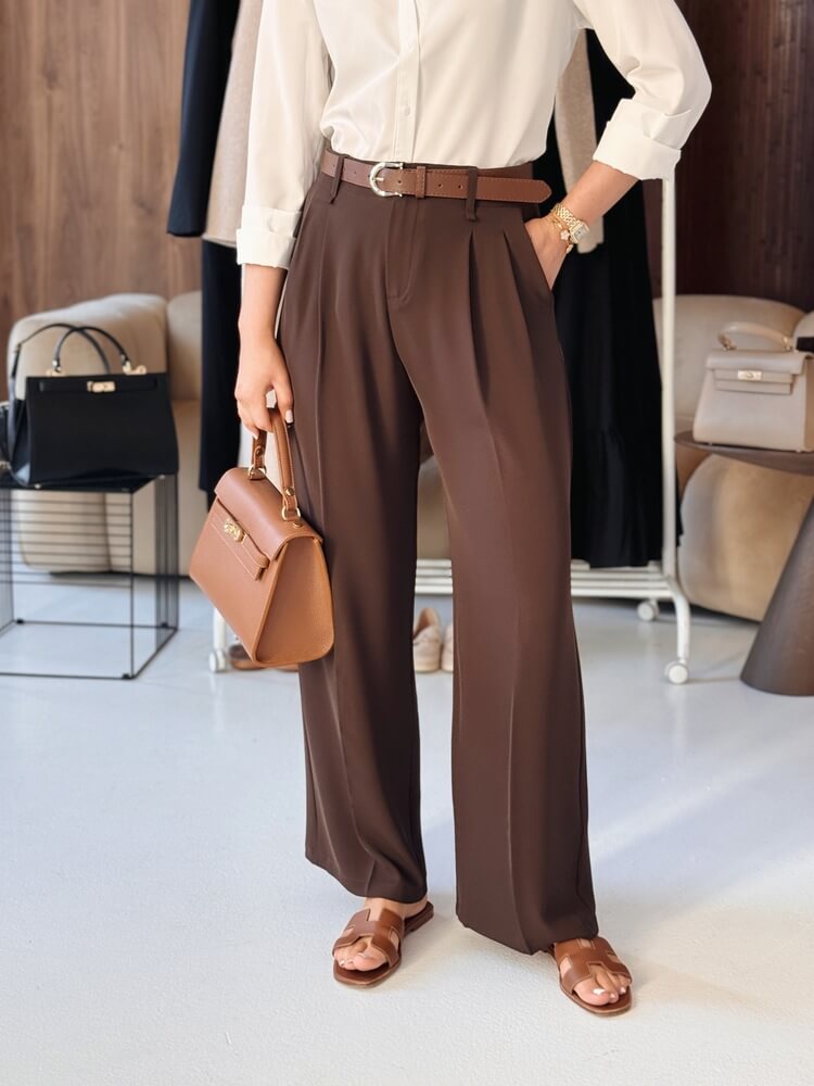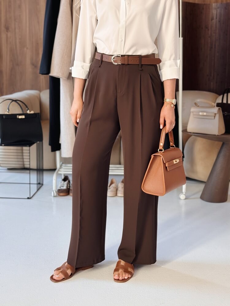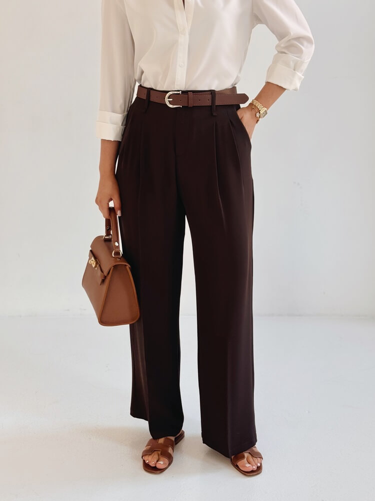 • Spodnie posiadają szlufki i brązowy pasek jako gratis w zestawie.