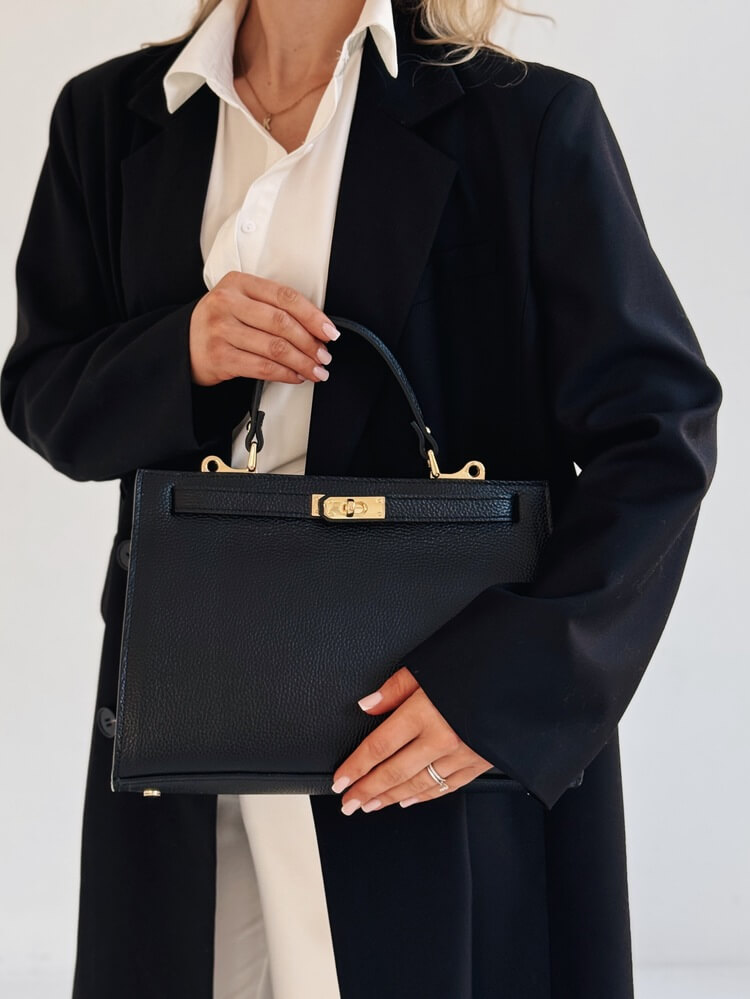 Złote okucia, zamknięcie w stylu Hermes.