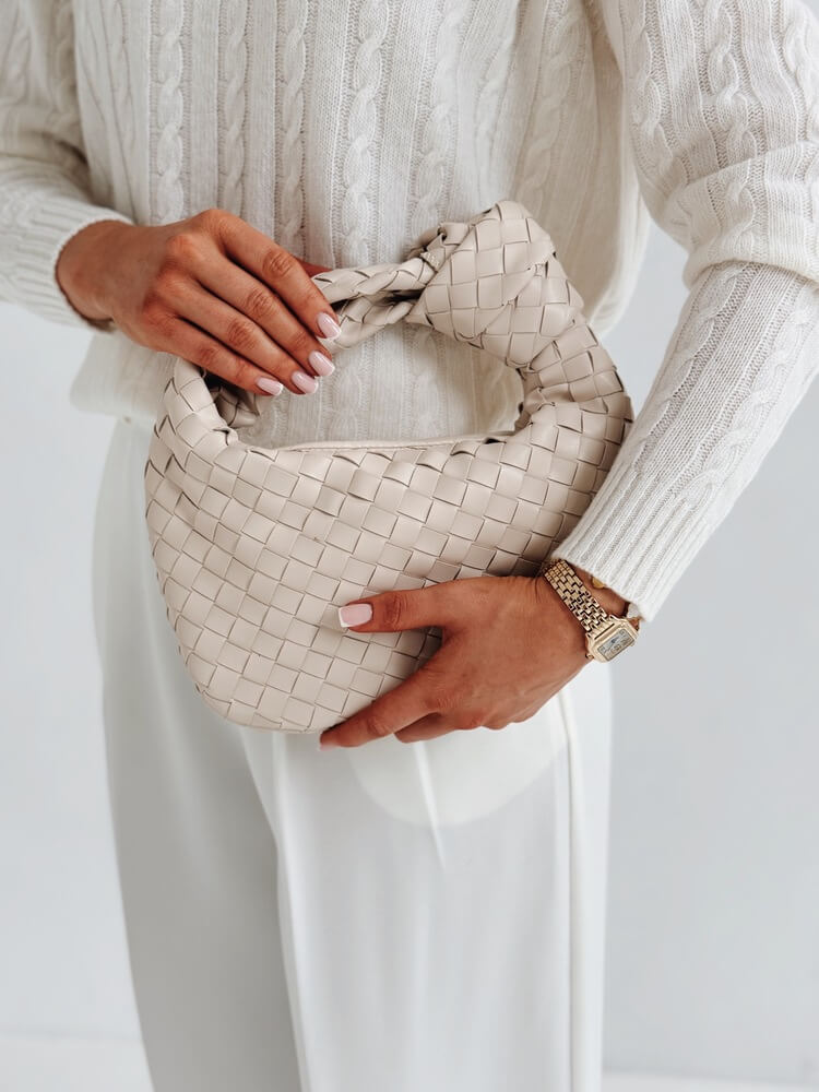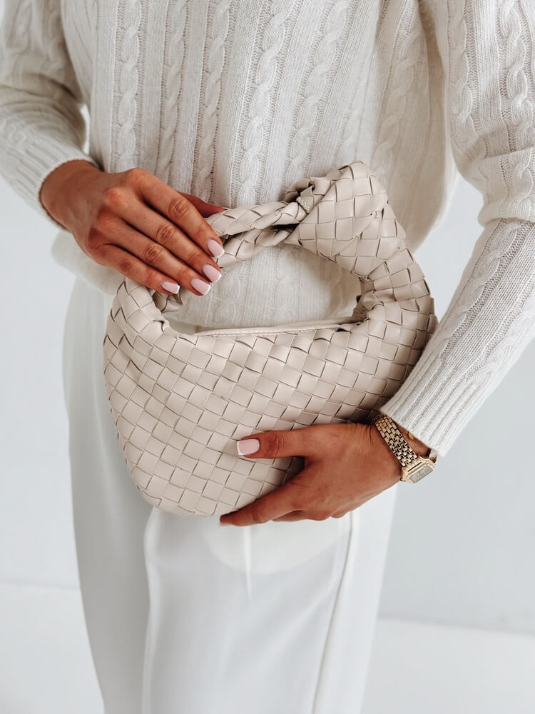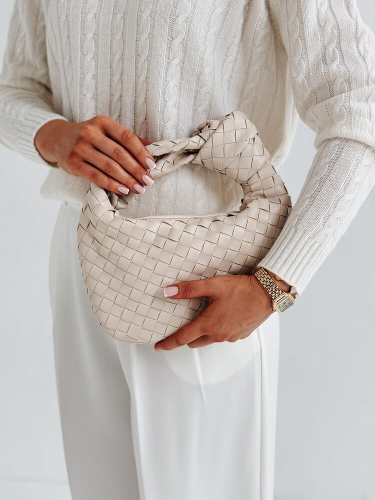 Torebka z plecionego materiału doskonale imitującego skórę.