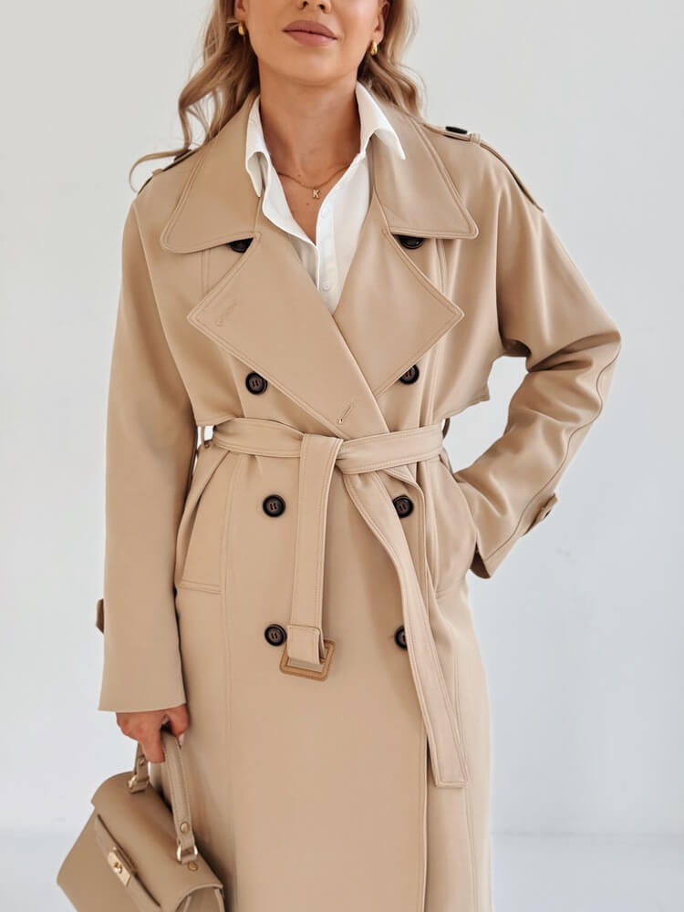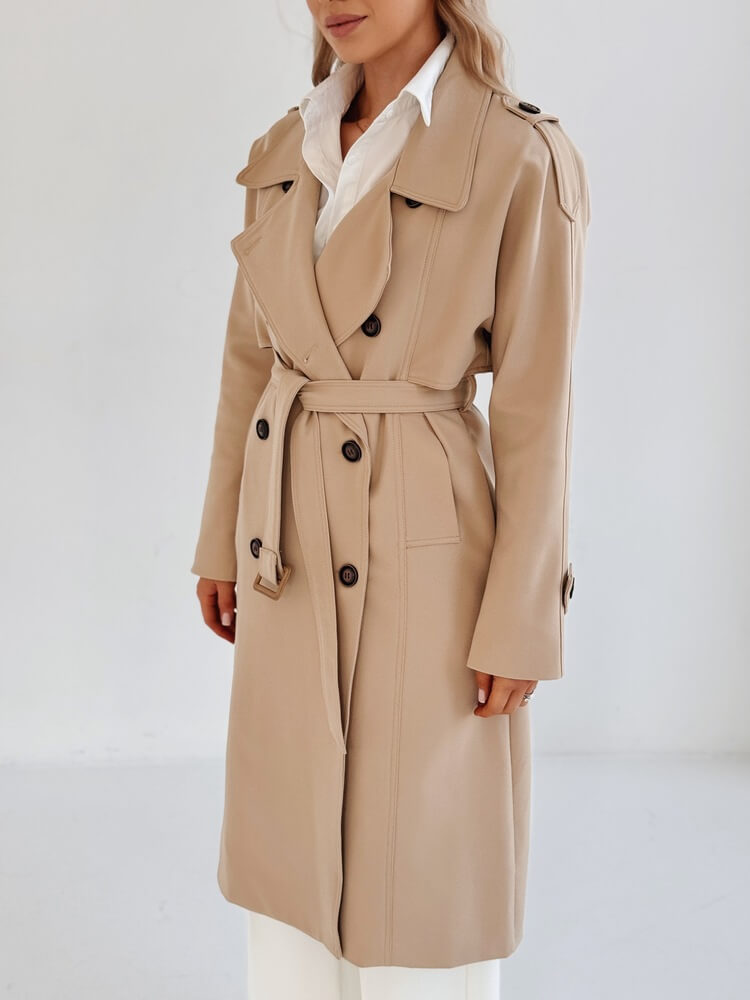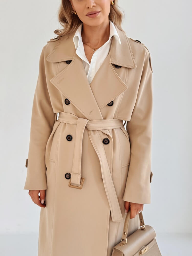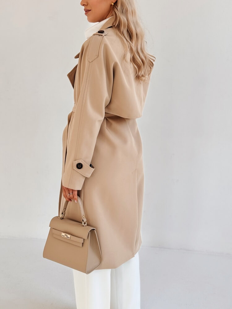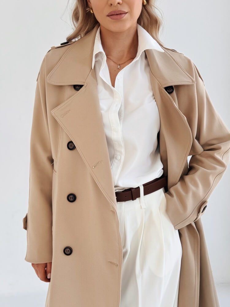 Klasyczny trench – prochowiec w kolorze beżowym.