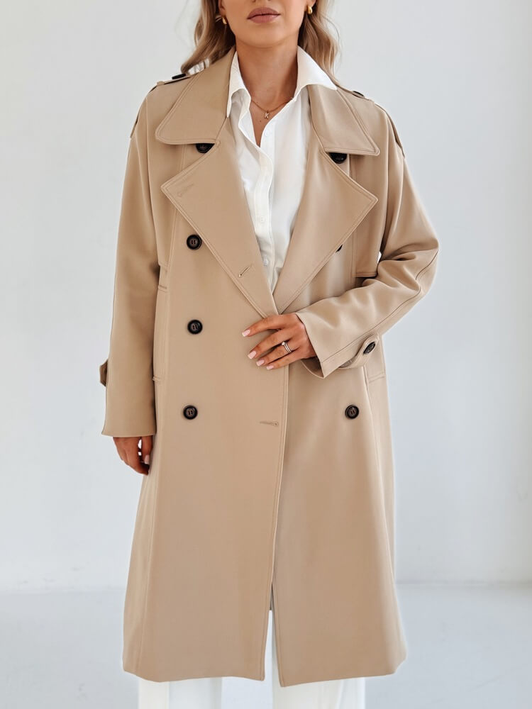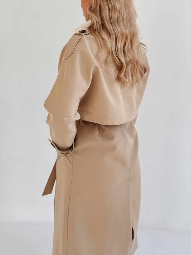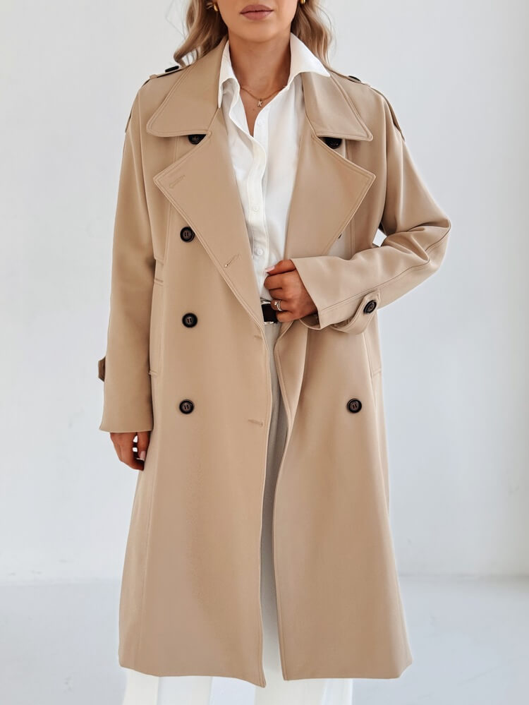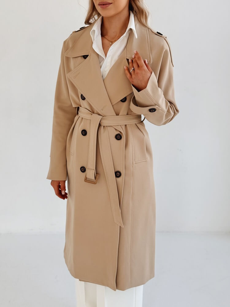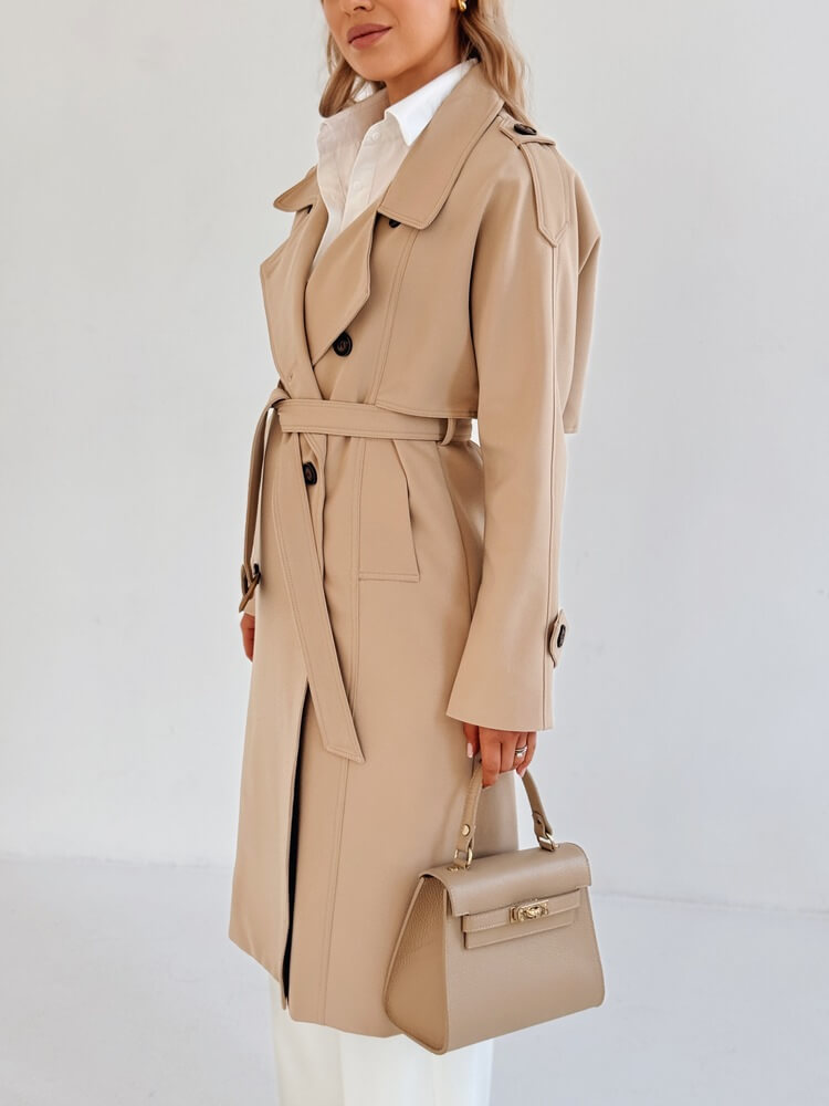 Klasyczny trench – prochowiec w kolorze beżowym.